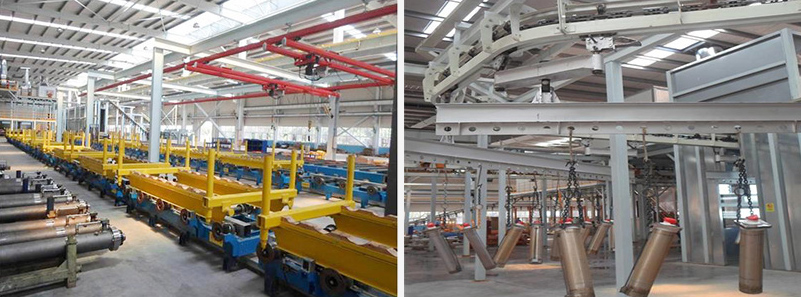 The integrated cylinder painting production line uses the XT160 suspension conveyor to transport the workpiece. The conveying speed is adjustable within 0.5-3m/min, and the working speed is 1.6m/min. The variable-width cylinder coating production line adopts the accumulation hanging conveyor, and the workpiece upper and lower parts are out. There is a hydraulic lifting platform to match the upper and lower conveying equipment of the workpiece; the telescopic cylinder painting production line uses the ground trolley to transport the workpiece, and the ground trolley adopts four sets of vertical ground chain conveying devices to transport the workpiece.