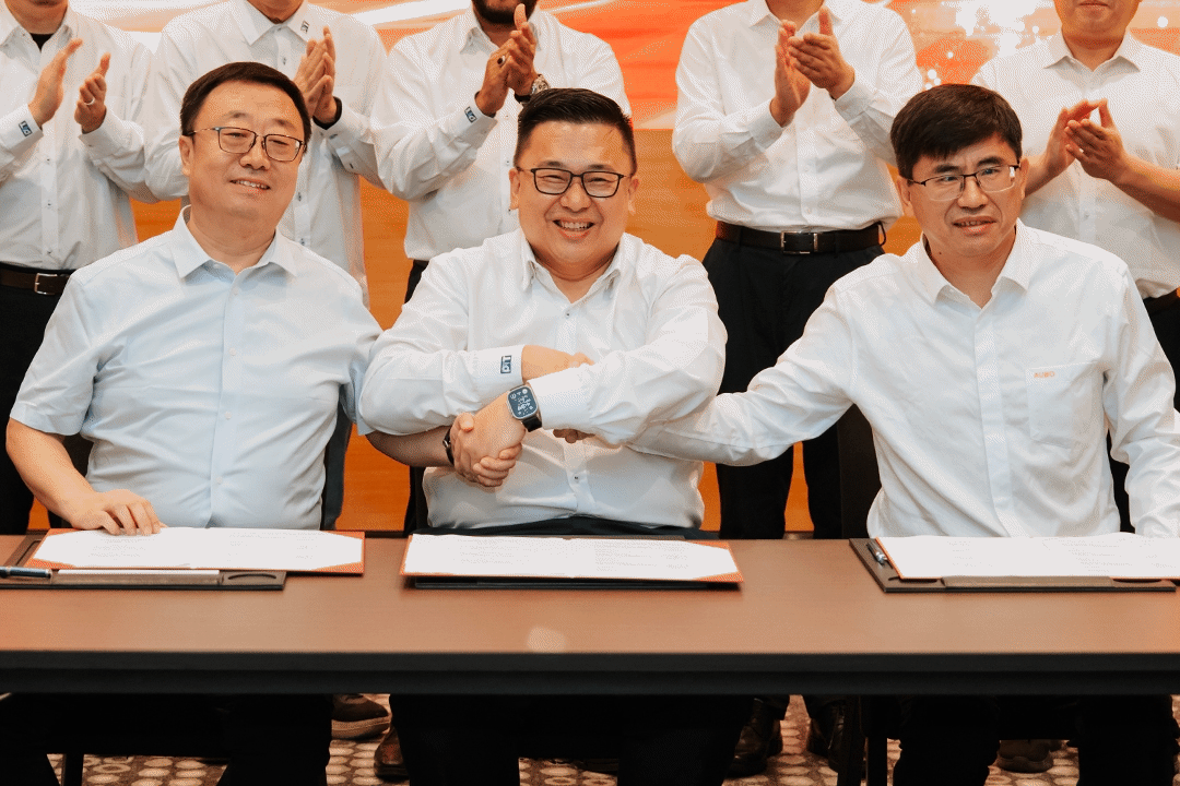 在各方見證下,東杰智能董事長韓永光、遨博智能董事長魏洪興與PTT集團(tuán)董事總經(jīng)理Teo Swee Phin共同簽署協(xié)議。